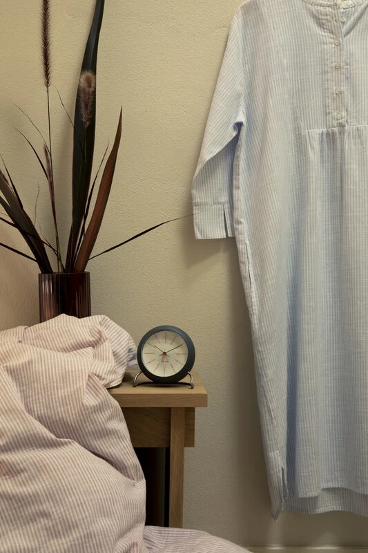 The AJ Bankers alarm clock is an updated version of the elegant table clock Arne Jacobsen designed in 1939. In addition to the graphic face, borrowed from the clock Jacobsen drew for the National Bank of Denmark in 1971, and the sleek metal base that refers to his iconic chair designs, the clock comes with new features such as a snooze function and a light sensor. The Bankers alarm clock makes a great gift idea and a stylish addition to any nightstand.