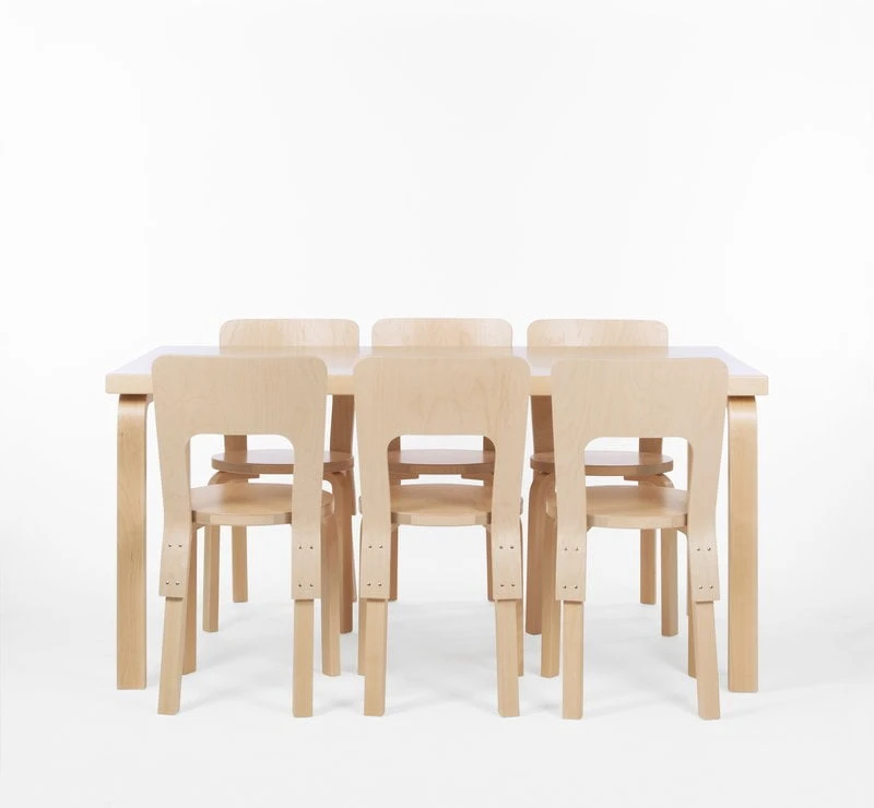 Artek’s Chair 66, designed in 1935, is one of the most popular dining chairs of Alvar Aalto and part of the permanent collection of MoMA, The Museum of Modern Art in New York. The timeless chair features Aalto’s patented L-leg structure, which allows the legs to be attached directly to the round seat. Compared to his other dining chairs, Chair 66 has a higher backrest that makes it comfortable to sit on and gives the design its distinct look.