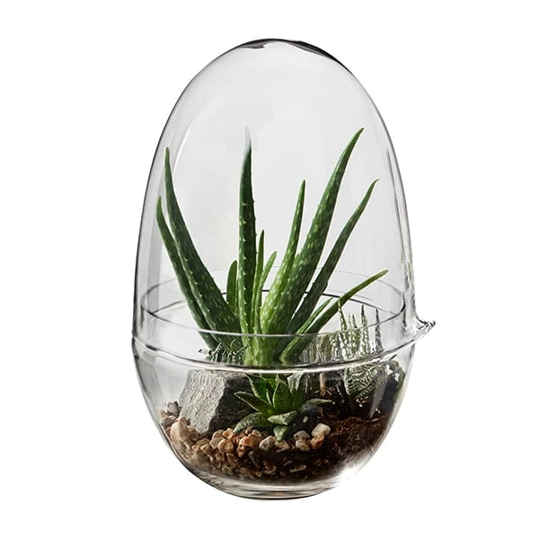 Grow mini greenhouse, designed by Caroline Wetterling for Design House Stockholm, provides an attractive setting for growing small plants and flowers, and it doubles as a beautiful decorative object. Grow mini greenhouse consists of two handmade glass parts: the bottom part is for the soil, and the top has a small spout which makes it suitable for watering the plant. The spout also functions as a valve that regulates the moisture and temperature inside the glass greenhouse.