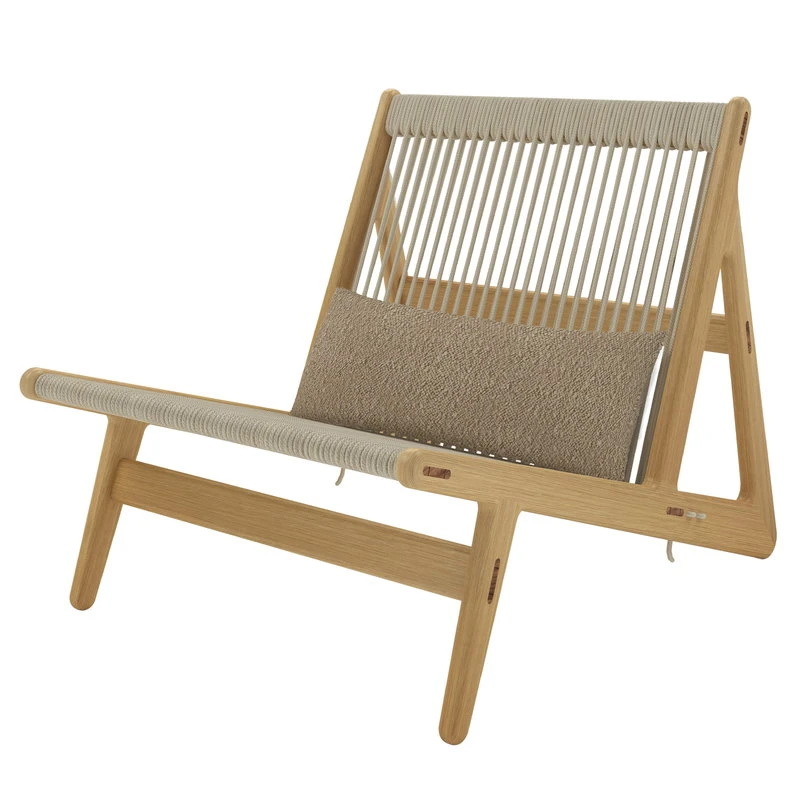 GUBI’s MR01 Initial chair, designed by Mathias Steen Rasmussen, is a unique lounge chair with influences from mid-century Danish design as well as Rasmussen’s background in cabinetmaking. The Initial chair has a uniquely shaped, gently inclined solid wood frame, but what makes the chair even more unique is its seat material: the seat and backrest are hand-woven from 90 meters of rope using a method developed by Rasmussen. Skillful, visible joints complete the chair’s organic charm.