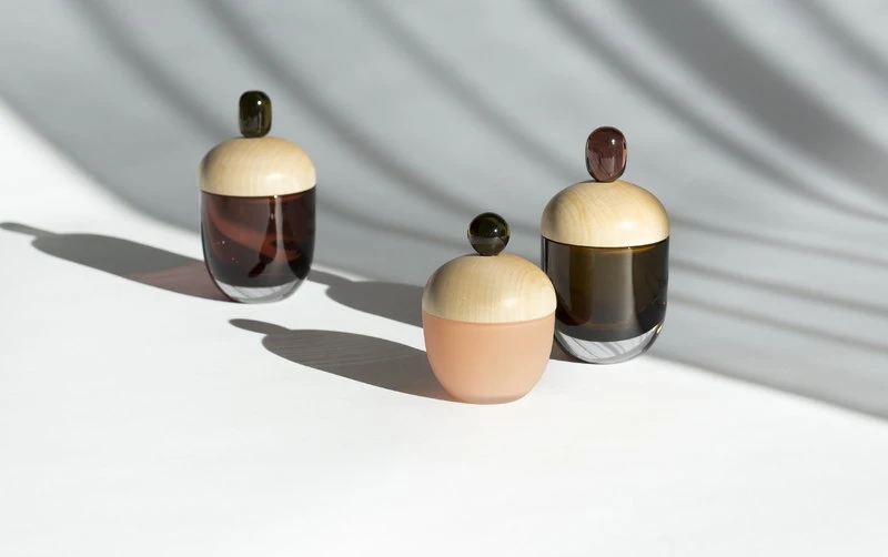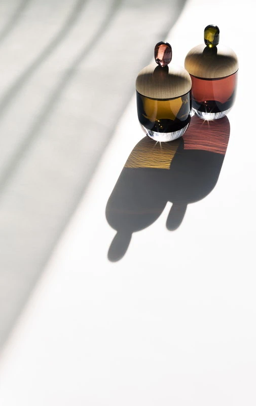 Katriina Nuutinen’s adorable Lyyli boxes combine the traditions of Finnish glassblowing and woodcrafting into a delightful, modern shape. The box is made of blown and colored glass and a rounded wooden lid, and the cherry on the cake is a tiny glass knob with a delicious color. The combination of light birch wood and shiny glass is cute and playful, and it only gets cuter in a group of several different boxes. Measuring 6.5 cm in diameter, the Lyyli boxes can be filled with pastils, paper accessories, clips, jewels and other small treasures.