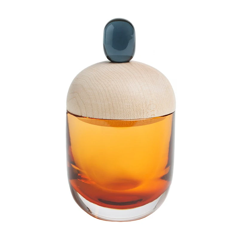 Katriina Nuutinen’s adorable Lyyli boxes combine the traditions of Finnish glassblowing and woodcrafting into a delightful, modern shape. The box is made of blown and colored glass and a rounded wooden lid, and the cherry on the cake is a tiny glass knob with a delicious color. The combination of light birch wood and shiny glass is cute and playful, and it only gets cuter in a group of several different boxes. Measuring 6.5 cm in diameter, the Lyyli boxes can be filled with pastils, paper accessories, clips, jewels and other small treasures.