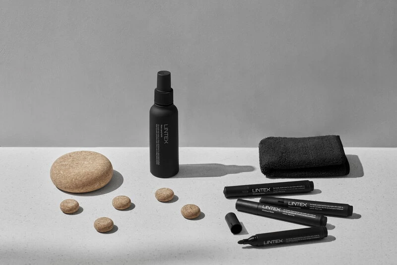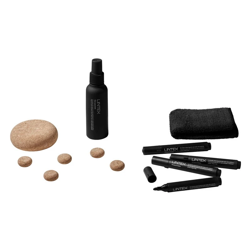 Lintex’s writing board accessory kit boasts the same stylish design expression as the brand’s sleek memo boards. The kit features accessories in a black monochrome look as well as magnets and a whiteboard eraser made of natural cork.