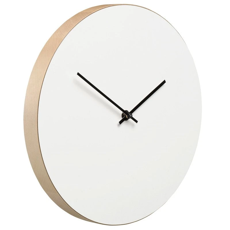 Kiekko wall clock, designed and manufactured by the Finnish Muoto2, features a simple clock face with sleek hands and coloured laminate surface. Edges of Kiekko are natural birch. The clock has high-quality German machinery that runs almost silent. The playful minimalism of Kiekko brings joy to homes and public environments alike. Designed by Kirsi Pasanen and Mikko Kentta from Muoto2, Kiekko wall clock has been manufactured in Lahti, Finland.