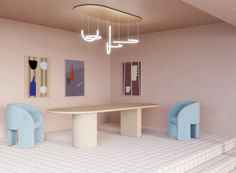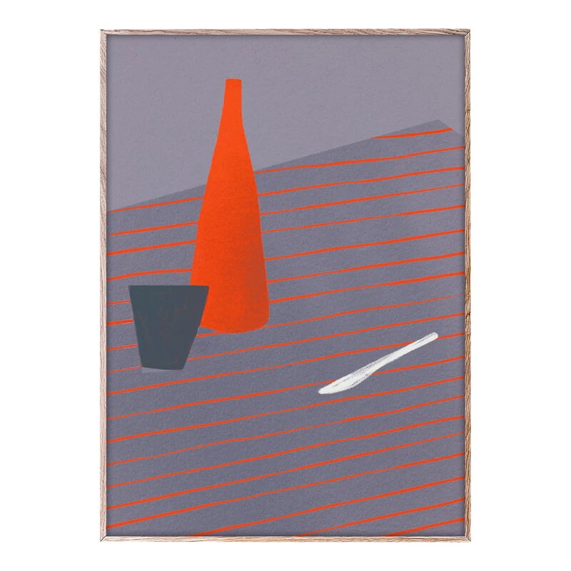 Paper Collective’s Il Sistema Degli Oggetti 02 poster by Milanese design studio, Studiopepe, features an intriguing composition balancing abstract and figurative. The pieces of tableware and cutlery arranged on top of a brisk striped pattern evoke images of a colorful table setting but leave room for interpretation. The vibrant shades and organic shapes of the charismatic poster lend the interior a powerful, mood-boosting touch.