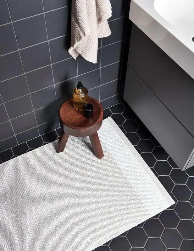 Pappelina’s Edit rug features a simple and timeless pattern woven in three colours, which blend into each other forming a vivid texture with a metallic sheen. The double-folded edges are hemmed with a strong seam, and one corner has a sewn-on rubber label with a Pappelina logo. The Edit rug can be washed by hand or in a washing machine.