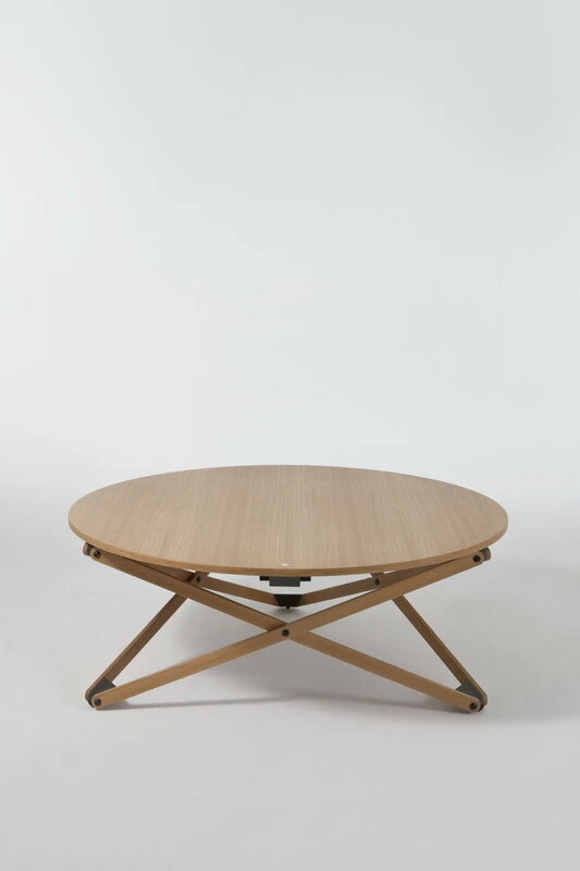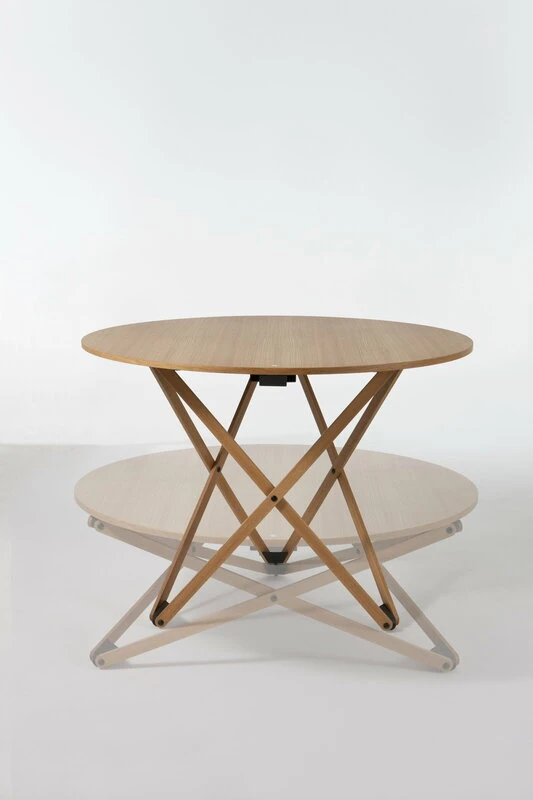 Santa & Cole’s Subeybaja table is an incredibly versatile wooden table that can be adjusted to seven different heights. Designed by Robert Heritage and Roger Webb, the Subeybaja table was released in 1979 and is made of oak. When adjusted to its highest position, Subeybaja functions as a dining table that is well suited also for smaller spaces, and when lowered, it transforms into a custom-height side table or coffee table. The discreet white dot on the edge of the table makes it easy to access the lever mechanism that is placed underneath the round tabletop.
