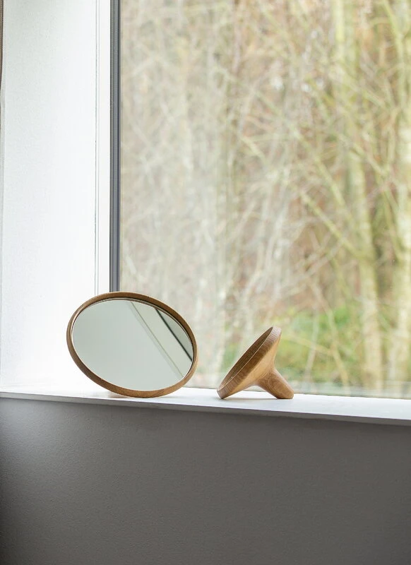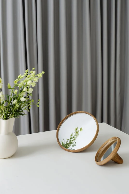 Spring Copenhagen’s Satellite is an attractive, round hand mirror framed by natural oak wood. The small handle of the mirror doubles as a stand, allowing you to place the mirror on a table in any room. Designed by Christoffer Skjøtt, the Satellite mirror is perfected with beautifully crafted wooden joints.