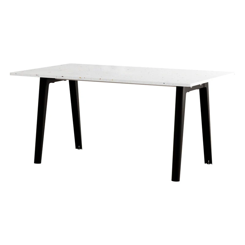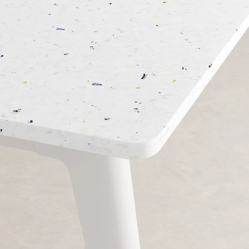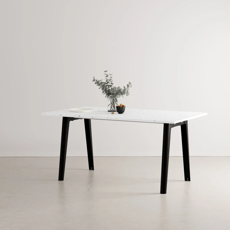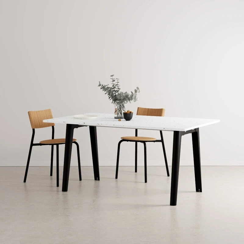 TIPTOE’s New Modern table is composed of a recycled plastic tabletop made from hundreds of yoghurt cups – hence the vivid terrazzo-like surface – and a streamlined steel frame, which consists of two pairs of trestle legs. The dining table was designed using as few parts as possible, and each part is made from durable and easily recyclable materials. The New Modern table is quick to assemble and disassemble, and it can be stored in a small space if needed.