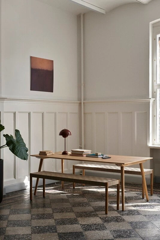 Designed by Jakob Thau and Sami Kallio for &Tradition, Betty TK5 is a solid wood bench with a linen webbing seat. The combination of the wooden surface and natural linen gives the bench an organic feeling, and the flexible and supporting webbing is pleasant to sit on. The stable and lightweight structure makes the Betty bench perfect for the dining space or any other room of the house.